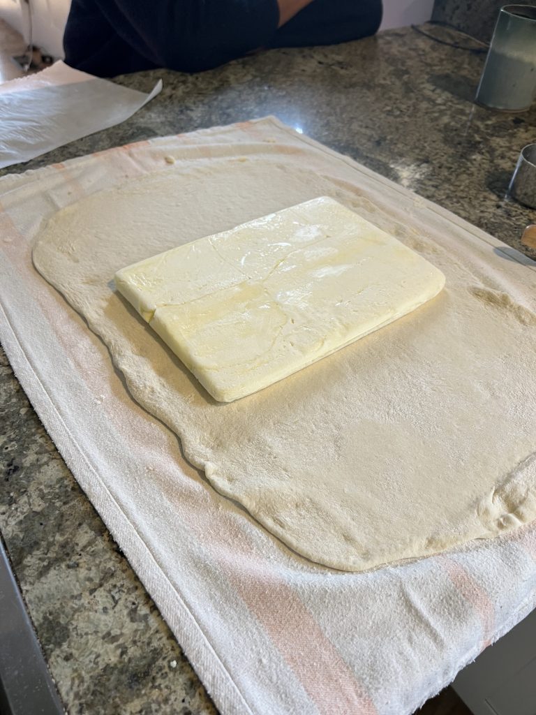 - After an hour, turn the dough out onto a floured board. Roll the dough so it is the width of the butter and three times as long. Place the butter in the center of the dough and fold the dough over the butter, like an envelope.