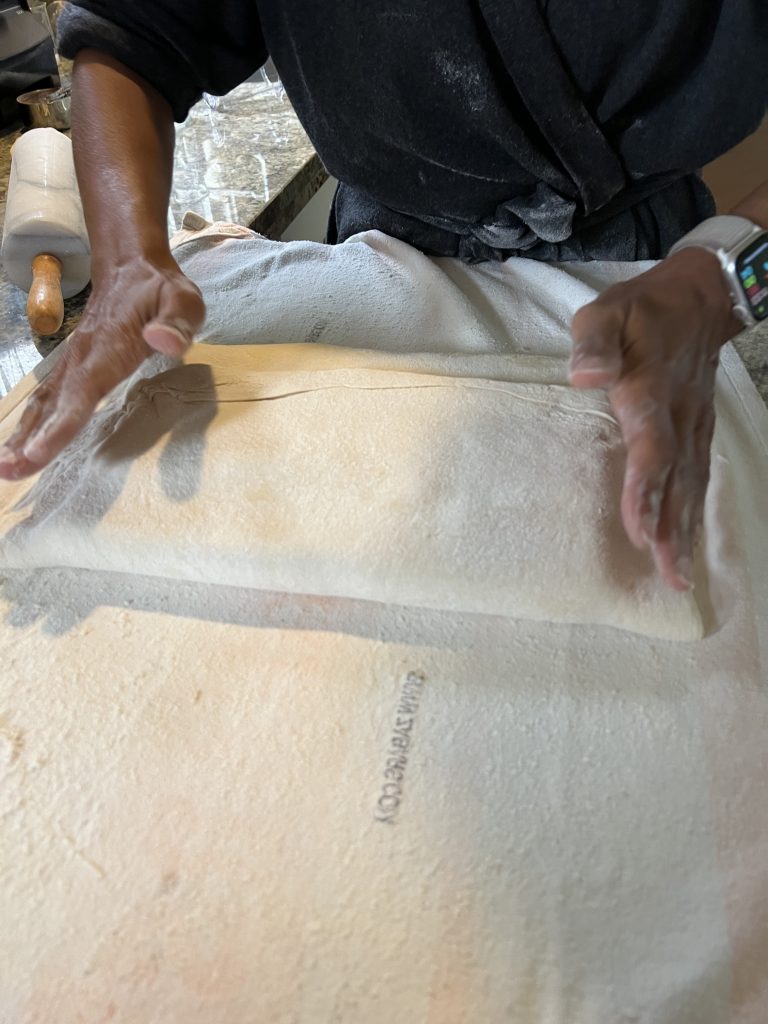 - fold the dough into thirds (again), make the 1/4 turn, and roll out again. Sprinkle an additional half cup sugar.