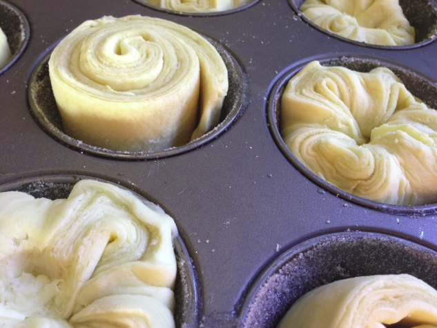 SPIRAL SHAPE: using a knife, slice off a strip of dough 1/2 inch wide; roll up like a sleeping bag and place in the muffin tin (left image).