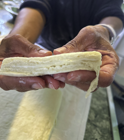 - Do this twice more to use the sugar, and then twice more after that without the sugar, ending by rolling out the dough, but not folding it. Your dough, if sliced, should have multiple layers and it should be about 1/3 inch thick (or thereabouts).